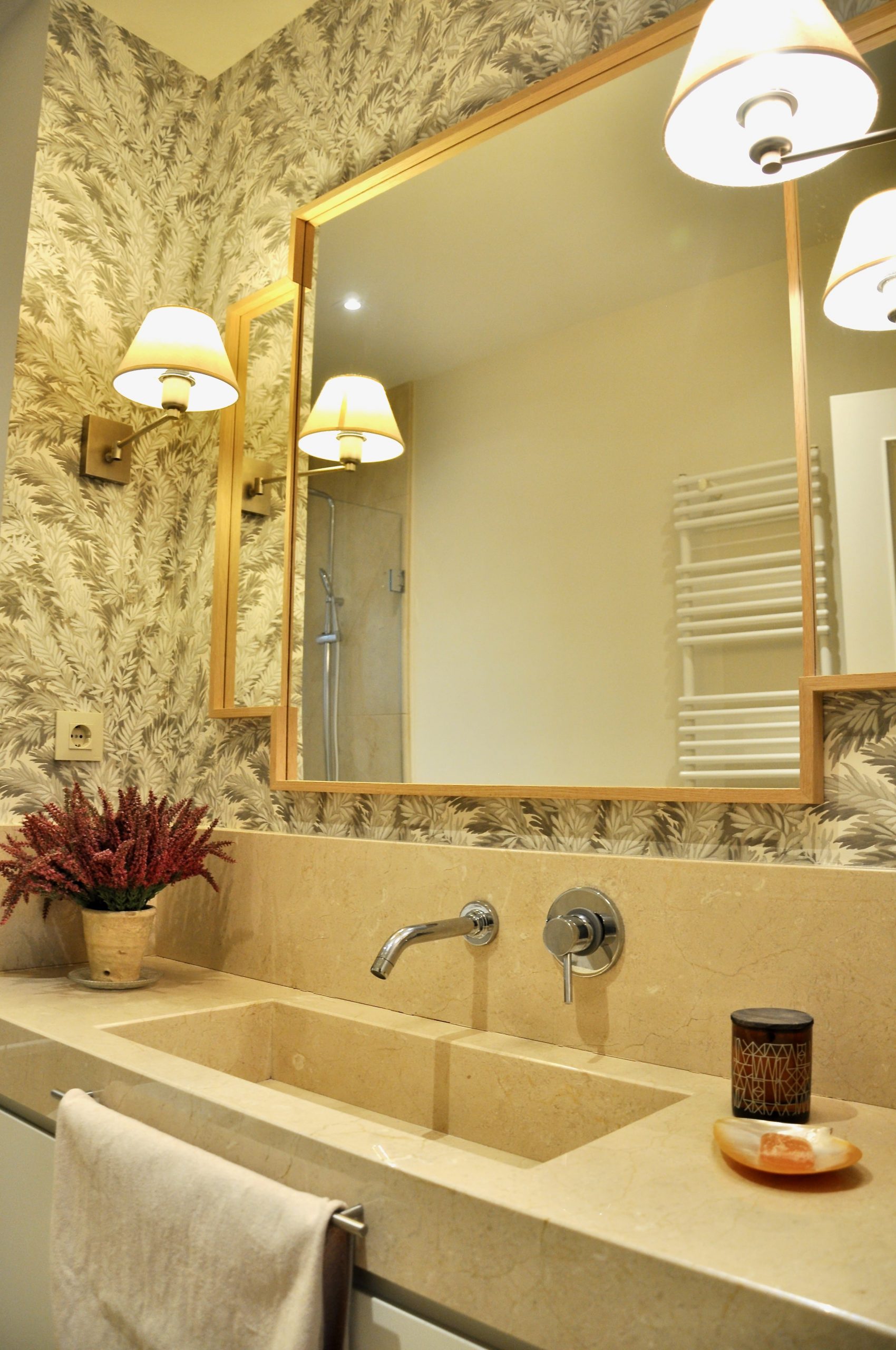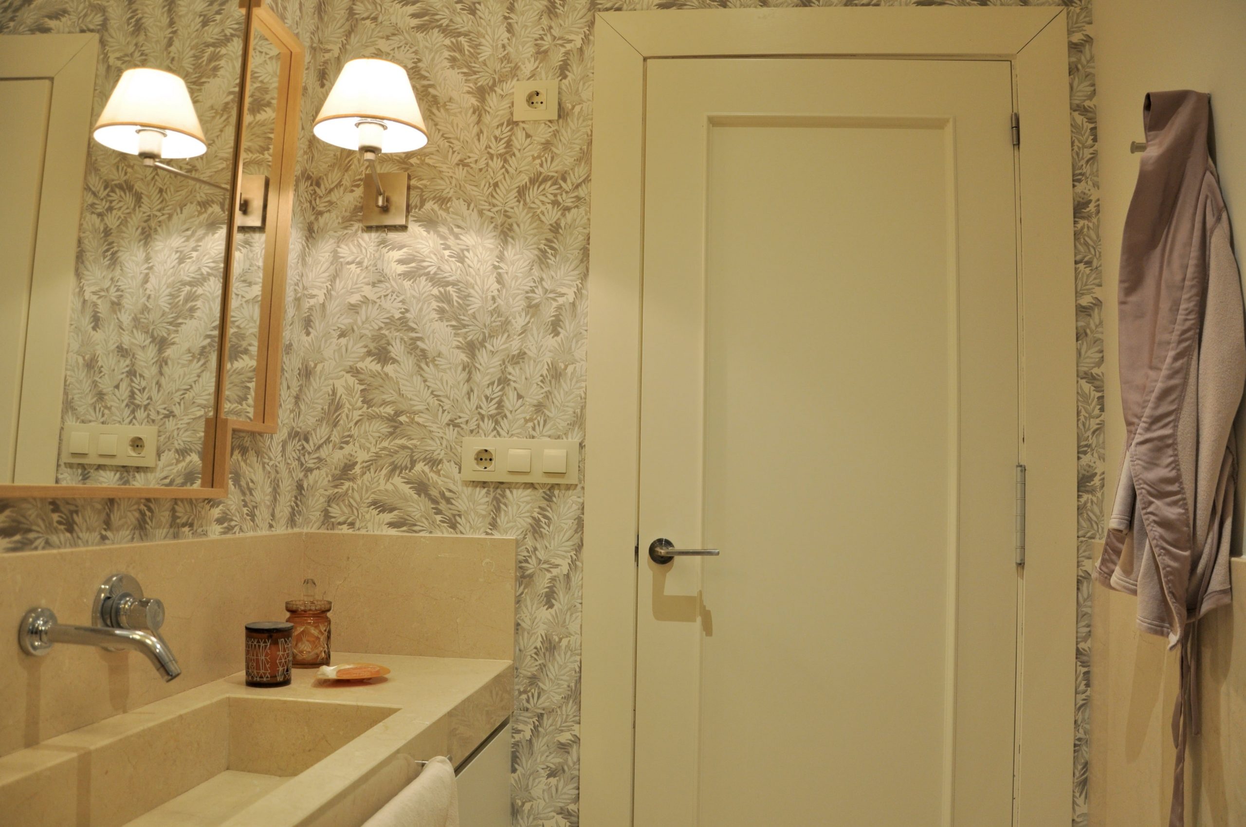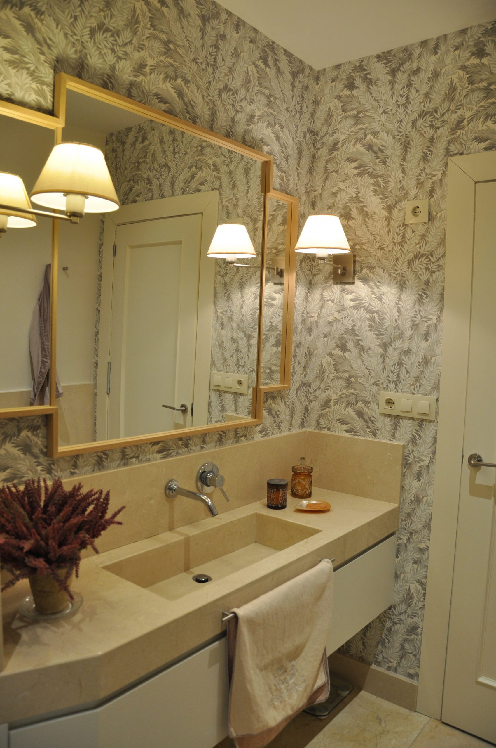 El segundo baño si ha sido una reforma en la que hemos incorporado una encimera de mármol con un toallero empotrado en el mismo. En la pared hemos combinado pintura y papel para hacer del baño un espacio acogedor.