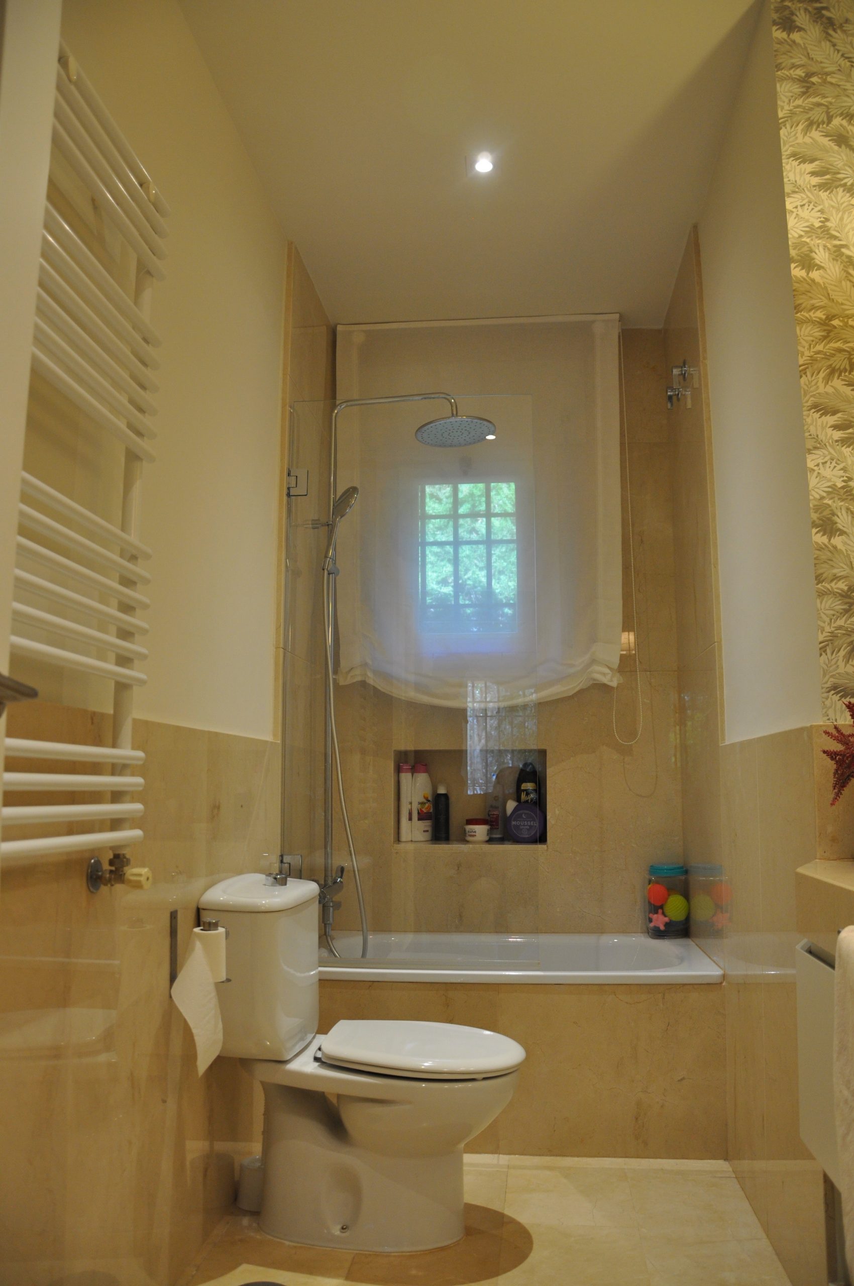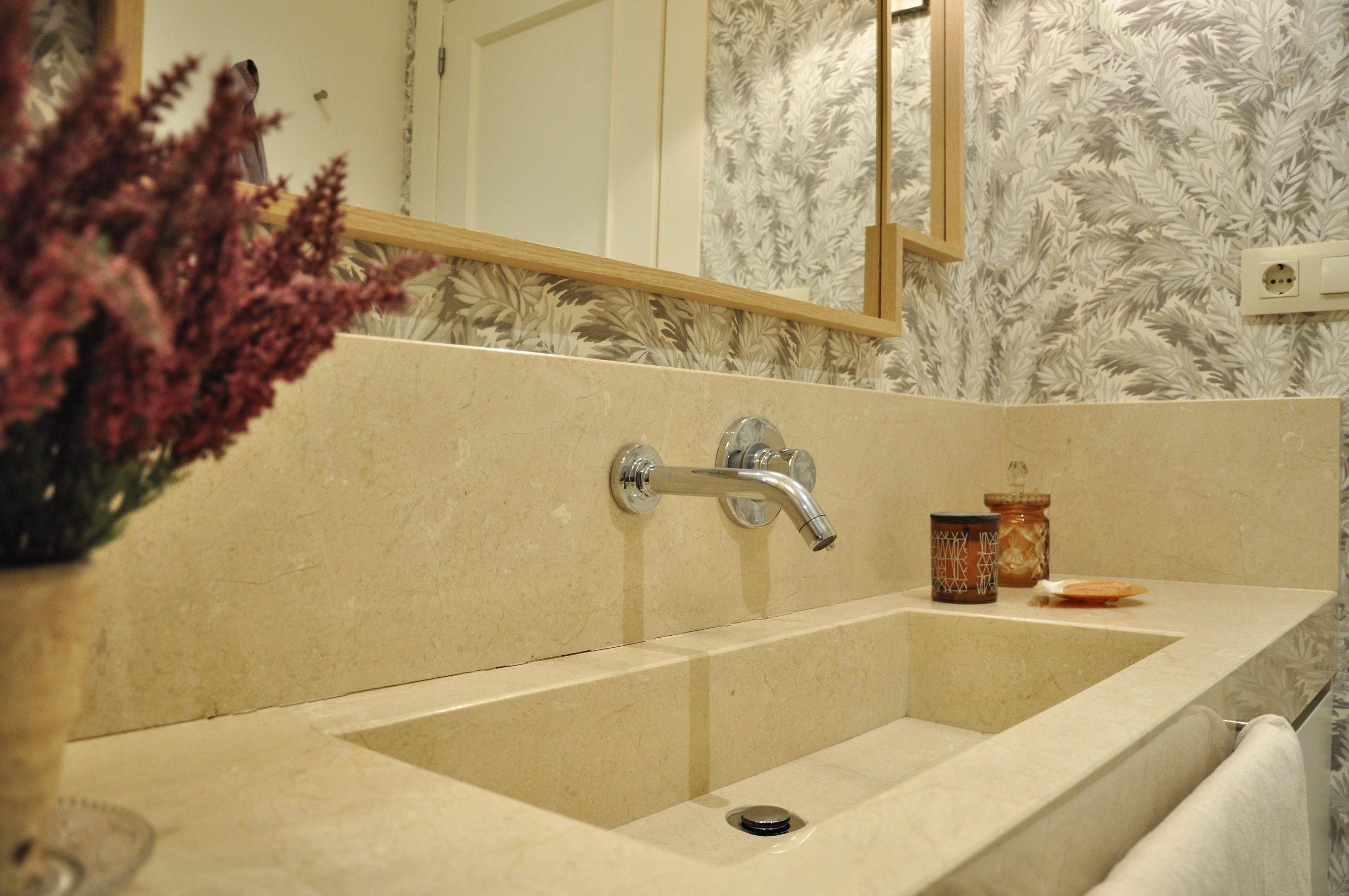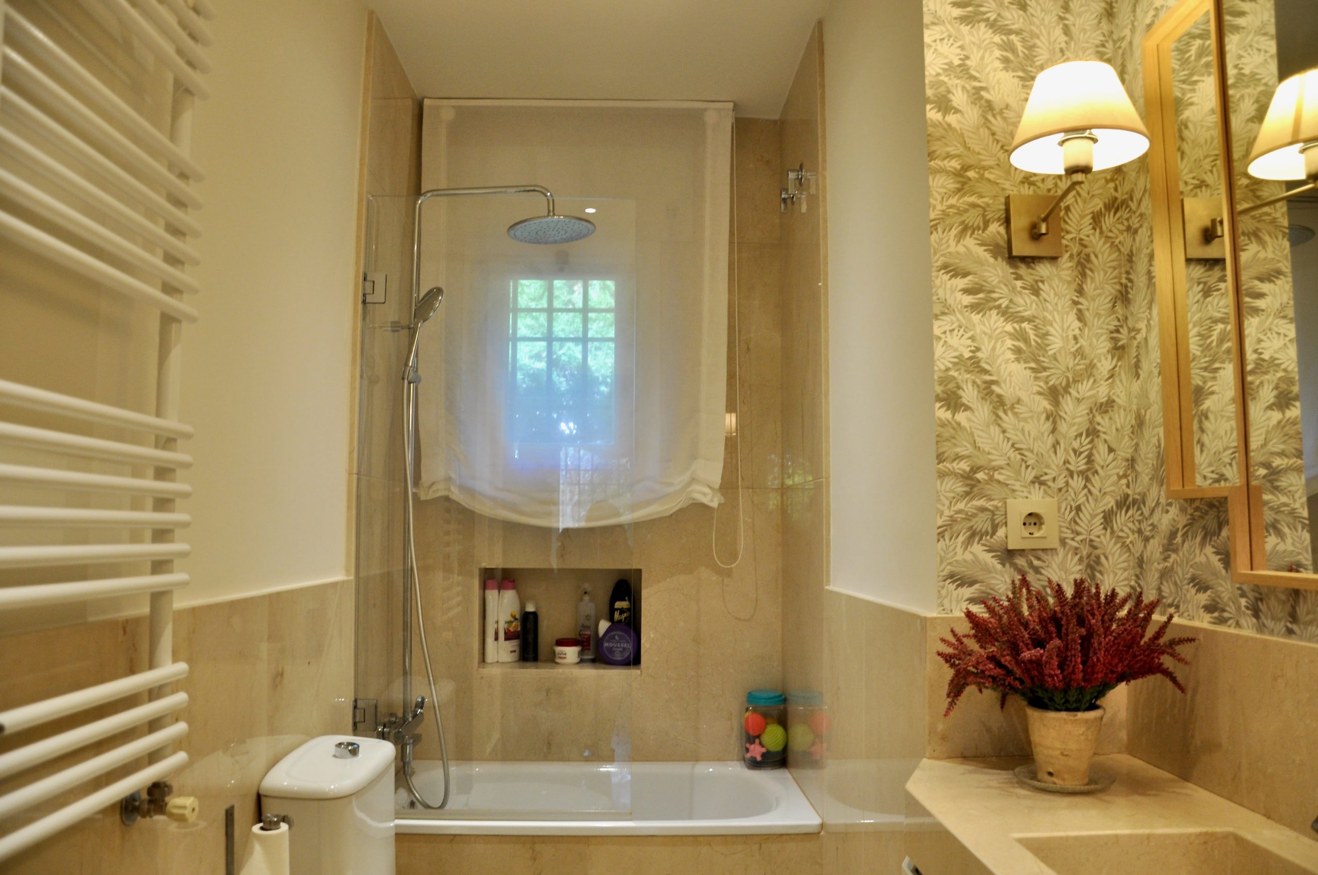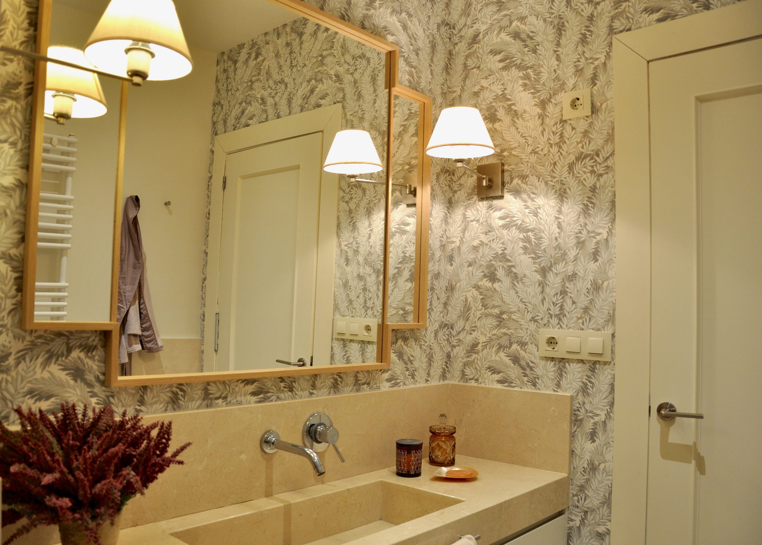 El segundo baño si ha sido una reforma en la que hemos incorporado una encimera de mármol con un toallero empotrado en el mismo. En la pared hemos combinado pintura y papel para hacer del baño un espacio acogedor.