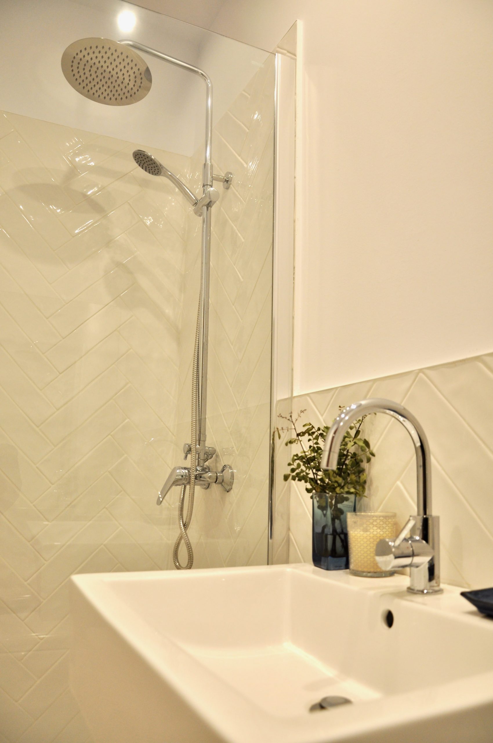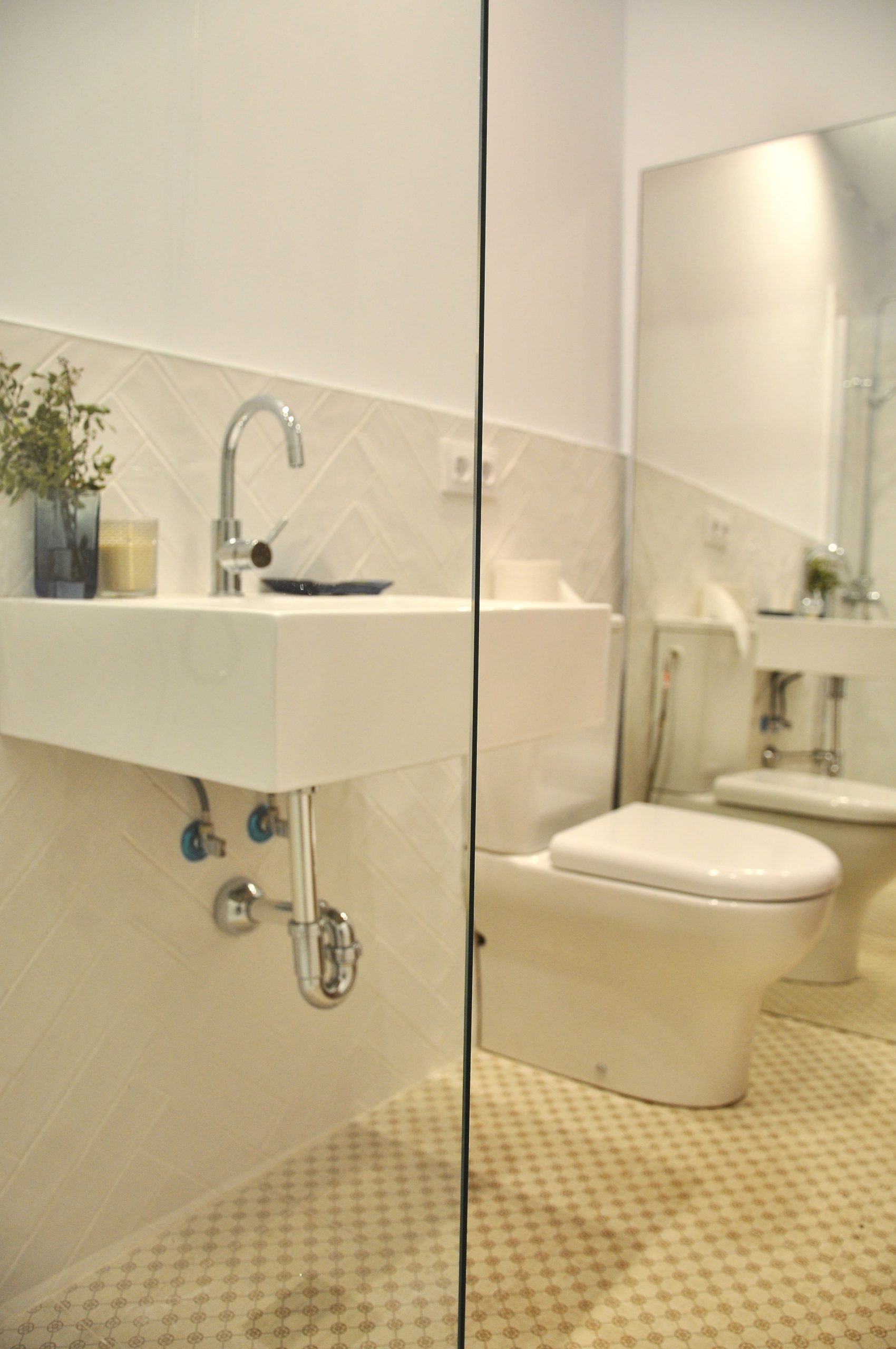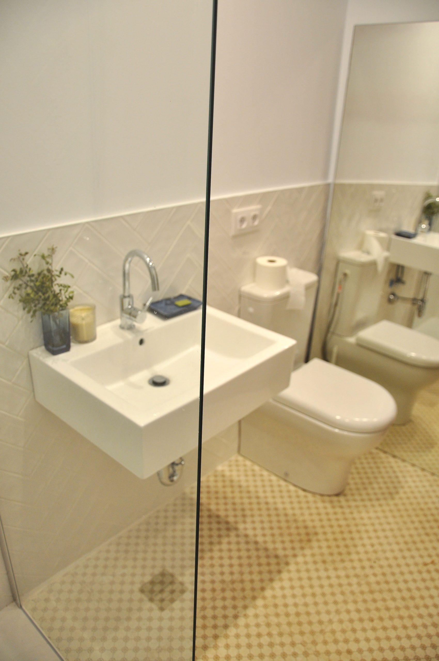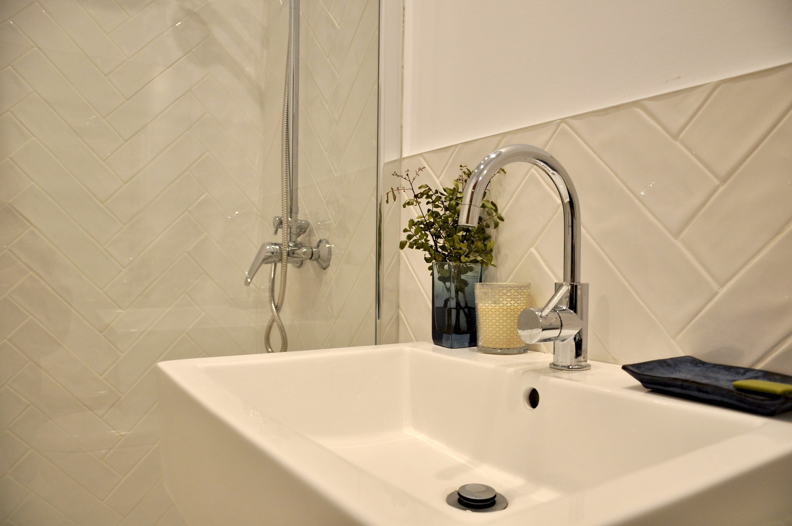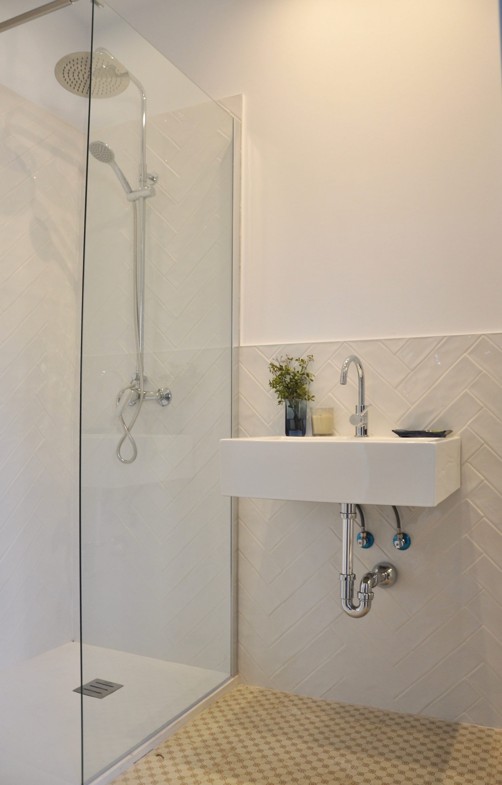 Uno de ellos ha sido una obra nueva que hemos hecho dentro de un espacio anexo a la casa. En este baño de nueva construcción hemos incluido azulejos en espigueta quedando tipo vintage.